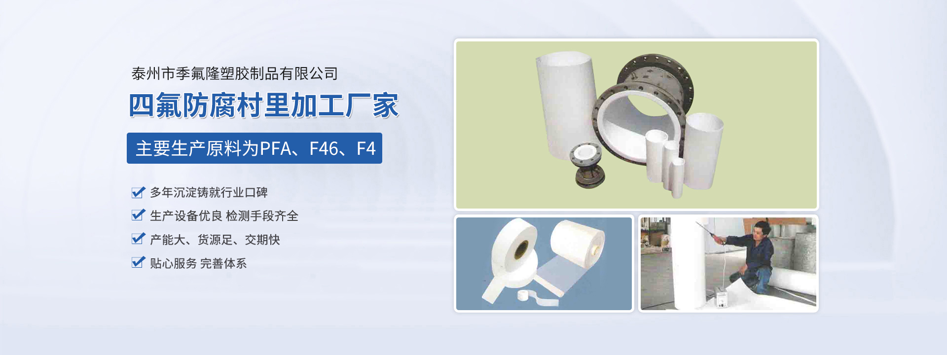 泰州市季氟隆塑膠制品有限公司(江蘇斯瑞沃爾科技發(fā)展有限公司)占地8000平方米,各類專用生產設備三十多合,現有員工近20人,其中技術人員10名,均多年從事該行業生產,經驗豐富。本公司主要生產原料為PFA、F46、F4,主要為電磁傳感器、防腐管道、各種容器反應釜三通四通彎頭及各種閥門等產品進行防腐村里加工,長期為德國、日本、美國、新加坡等國在華合資公司配套,產品廣泛應用于環(huán)保、油田、化工、造紙、冶金等行業,產品質量優(yōu)良,服務及時周到,一直深受顧客信賴。